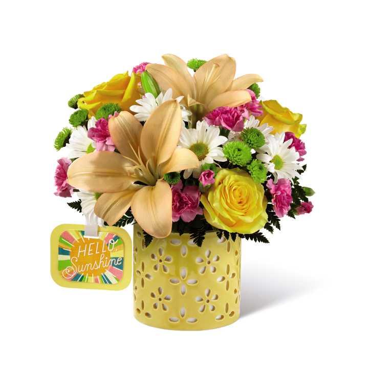 Envoyez un rayon de soleil chaud et vos pensées les plus heureuses directement à leur porte avec The FTD® Brighter Than Bright ™ Réunissant une collection inspirante de fleurs, y compris les roses jaunes, les lys asiatiques de pêche, les oeillets jaunes, les marguerites blanches, les boutons poussoirs verts et les mini œillets aux roses chaudes, cet magnifique arrangement floral est décoré dans un vase en céramique jaune souvenir, façonné avec une coupe douce Sur le design, et arrive avec une étiquette Hallmark qui lit, "Hello Sunshine".
