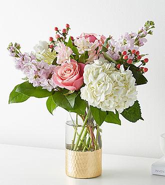 Cet élégant arrangement composé de roses, d'alstroemeria, de baies d'hypericum et d'œillets présenté dans un vase trempé dans l'or charmera son destinataire. Aussi élégant qu'un collier de perles, ajoutez une touche de classe à n'importe quelle pièce avec des roses et des marguerites gerbera.