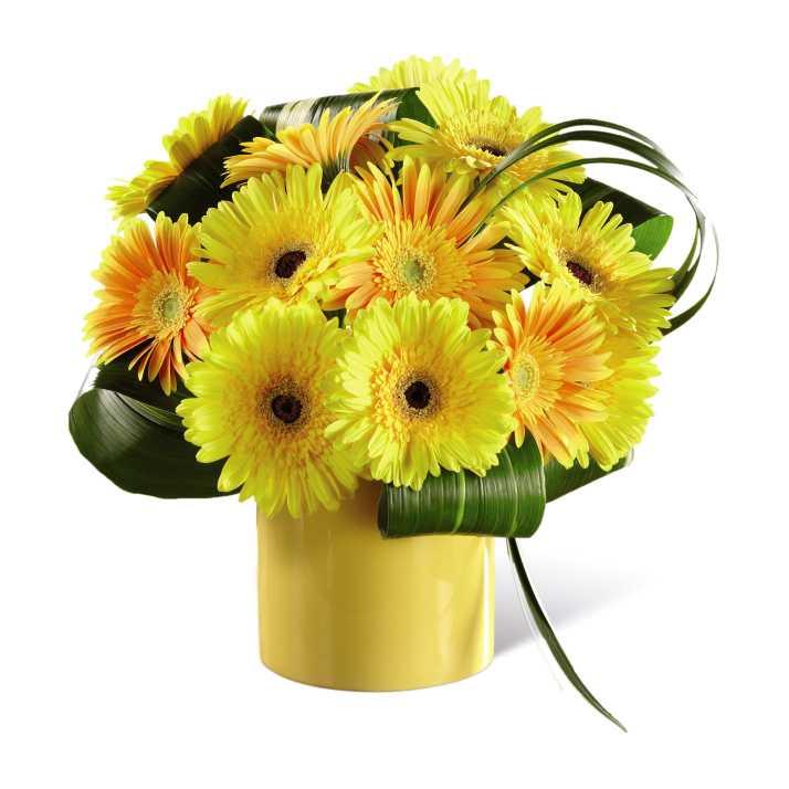 L'une des meilleures surprises dans la vie est de recevoir des fleurs de façon inattendue et ce bouquet de fleurs est prêt à ravir votre destinataire avec énergie et lumière en l'honneur des moments les plus précieux de la vie ou sans raison, mais pour les faire sourire. Des marguerites vibrantes de gerbera jaune et des marguerites de gerbera orange sont organisées pour montrer leur couleur brillante et brillante, accentuée avec des paillettes de lys et des feuilles tropicales luxuriantes situées dans un vase en céramique cylindrique jaune. Un anniversaire inoubliable, bien-être ou cadeau félicitation!