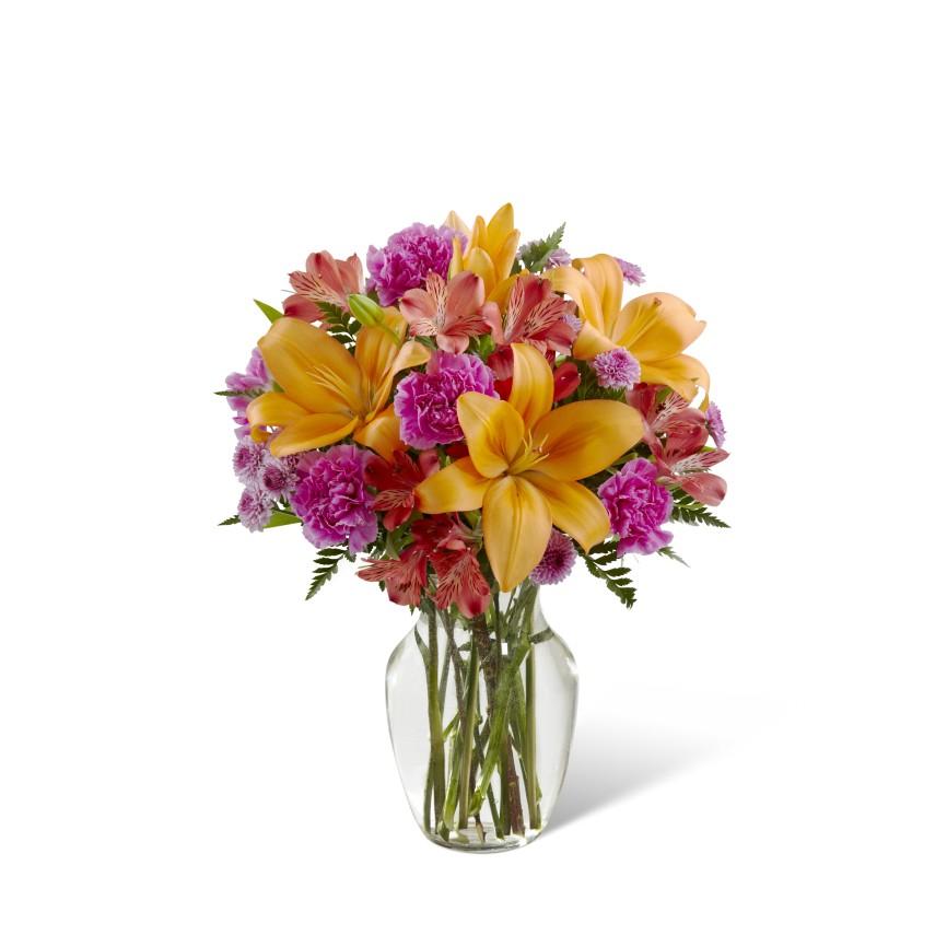 Le bouquet The Light of My Life™ s'épanouit avec une couleur brillante et une douce sophistication pour créer l'impression parfaite ! Les lys asiatiques orange font danser les yeux sur le design unique de ce bouquet de fleurs, entouré des couleurs rougissantes des alstroémères rouges, des boutons-poms lavande, des œillets fuchsia et des verts luxuriants. Présenté dans un vase en verre transparent.