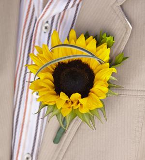 S'inscrivant dans le thème champêtre, cette boutonnière apportera un rayon de soleil sur les garçons d'honneur à votre mariage. Un tournesol miniature expose ses pétales jaune pâle contrastant avec son centre marron, accentué de feuilles de citronnelle et de myrte pour un look parfait. Approx. 10 cm H. x 13 cm L.