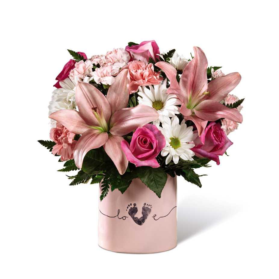 Le FTD® Tiny Miracle ™ Nouveau Baby Girl Bouquet est le moyen idéal pour envoyer vos meilleurs voeux à la nouvelle famille! Ce magnifique bouquet de fleurs réunit des roses roses, des roses roses asiatiques, des œillets roses, des mini œillets roses, des marguerites traditionnelles blanches et des légumes verts pour créer un cadeau mémorable. Présenté dans un vase de céramique rose souvenir avec "Love" écrit dans une police script sur le front, et l'impression d'un pied de bébé faisant le 'V' dans le mot pour un effet doux et touchant, cette arrangement de fleurs fraîches est un merveilleux Façon d'envoyer vos félicitations aux amis et à la famille à cette heure joyeuse dans leur vie.