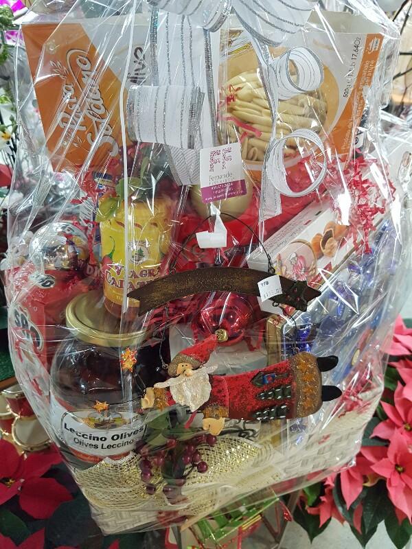 Ce gros panier contient tout pour se faire un bon souper de pâtes: les pâtes, olives, huile d'olive, piments, chocolats, biscuits et plus.