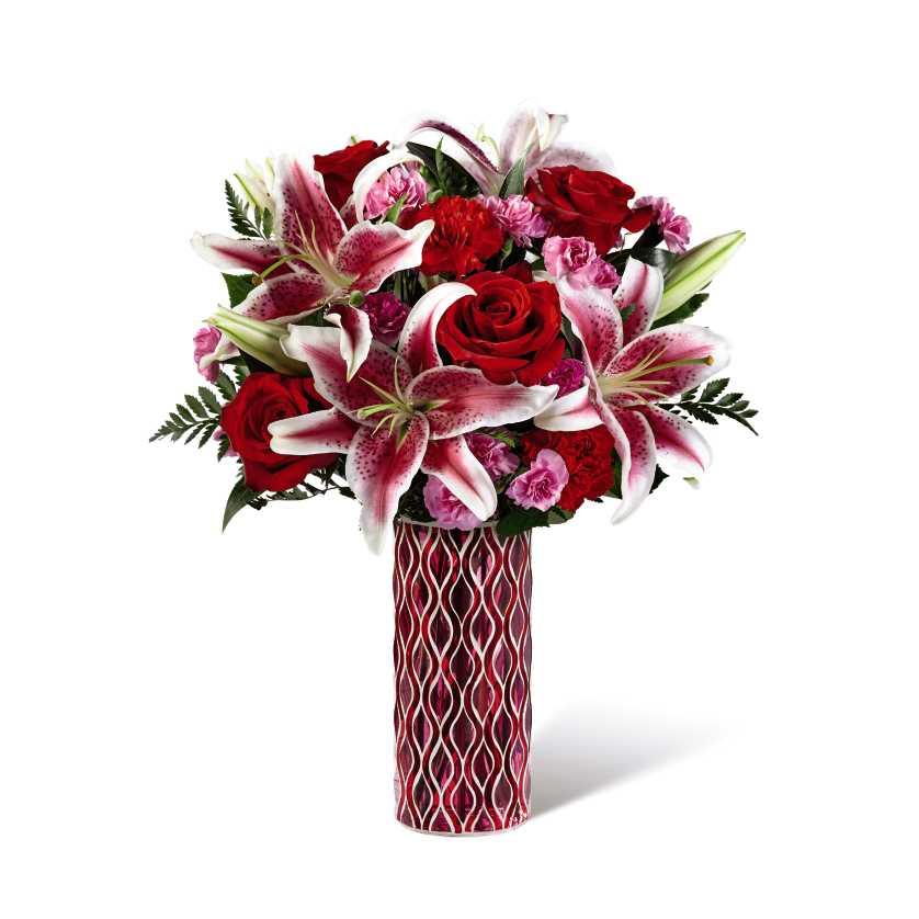 Un amour qui défie les limites du temps, ce magnifique bouquet de fleurs Valentine a été conçu pour exprimer le cœur de chaque émotion. Les roses rouges riches et les lys Stargazer sont vraiment fascinants entourés par les oeillets rouges, les mini œillets roses et les verts luxuriantes. Présenté dans un vase en verre de mosaïque rouge et rose de souvenir avec un modèle moderne, ce bouquet de fleurs romantique est réglé pour vous faire le coeur spécial de quelqu'un battre un peu plus vite ce 14 février.
