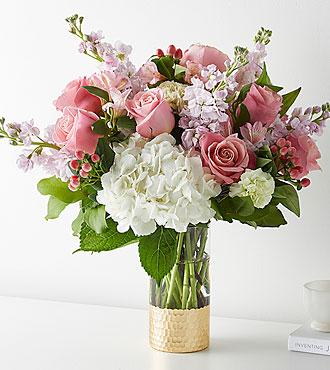 Cet élégant arrangement composé de roses, d'alstroemeria, de baies d'hypericum et d'œillets présenté dans un vase trempé dans l'or charmera son destinataire. Aussi élégant qu'un collier de perles, ajoutez une touche de classe à n'importe quelle pièce avec des roses et des marguerites gerbera.