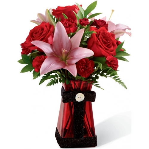 Le Bouquet FTD®, l'Amour arrive a grands pas™ est une expression chaleureuse de vos desirs les plus profonds. Des roses rouges brillantes, des lis asiatiques roses, de mini œillets bourgognes et de luxueuse verdure sont magnifiquement arrangés dans un vase en verre carré, de rubis et mis en valeur au cou par un ruban de velour noir déployant ainsi un bouton unique, fesant de ce bouquet un cadeau qui présentera vos intentions les plus romantiques.